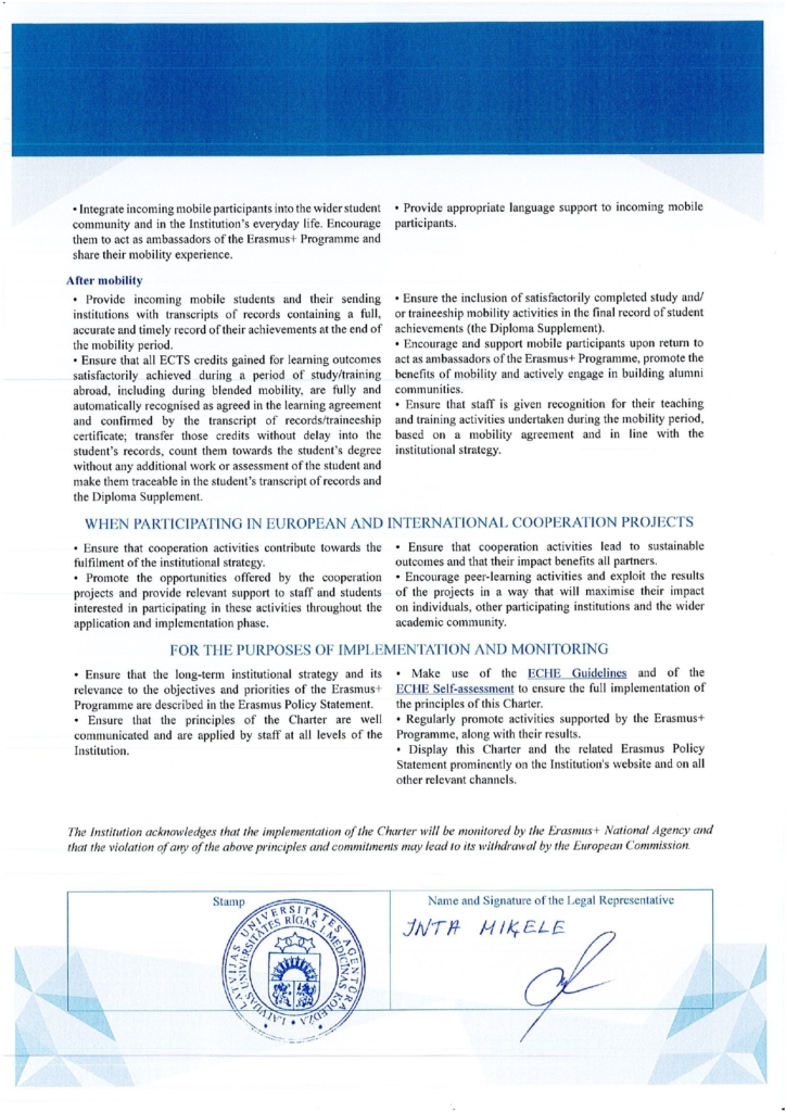 The Erasmus University Charter is a written document issued by the European Commission that enables higher education institutions to participate in Erasmus activities. The Charter sets out basic principles for higher education institutions that they have to follow when organizing and implementing Erasmus activities.