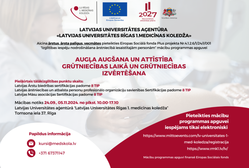 Aicina ārstus, ārsta palīgus un vecmātes pieteikties Eiropas Sociālā fonda Plus projekta Nr.4.1.2.6/1/24/I/001 “Izglītības iespēju nodrošināšana ārstniecībā iesaistītajām personām” neformālās izglītības programmas apguvei "Augļa augšana un attīstība grūtniecības laikā un grūtniecības izvērtēšana".