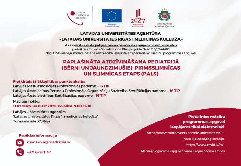 Aicina pieteikties Eiropas Sociālā fonda Plus projekta Nr.4.1.2.6/1/24/I/001 “Izglītības iespēju nodrošināšana ārstniecībā iesaistītajām personām” mācību programmas apguvei "Paplašināta atdzīvināšana pediatrijā (bērni un jaundzimušie): pirmsslimnīcas un slimnīcas etaps (PALS)".