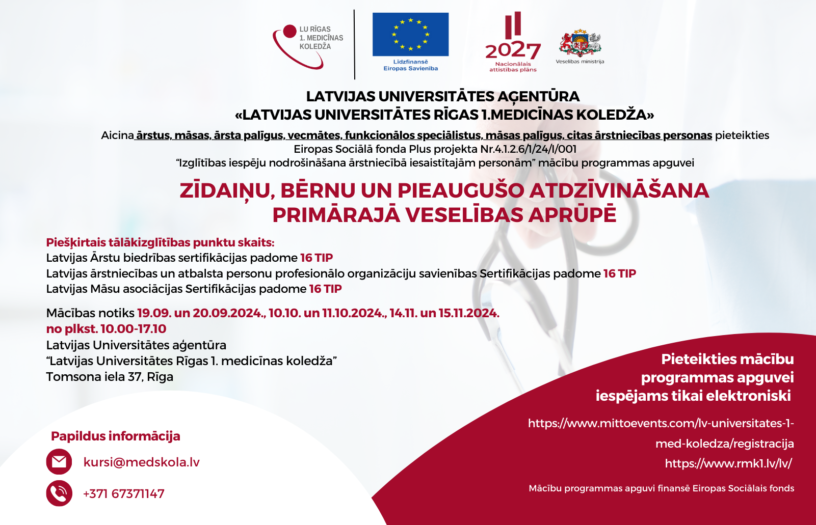 Aicina ārstus, māsas, ārsta palīgus, vecmātes, funkcionālos speciālistus, māsas palīgus, citas ārstniecības personas pieteikties Eiropas Sociālā fonda Plus projekta Nr.4.1.2.6/1/24/I/001 “Izglītības iespēju nodrošināšana ārstniecībā iesaistītajām personām” mācību programmas apguvei "Zīdaiņu, bērnu un pieaugušo atdzīvināšana primārajā veselības aprūpē".