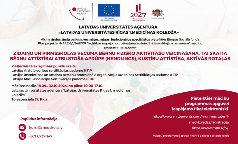 Aicina ārstus, ārsta palīgus, vecmātes, māsas, funkcionālos speciālistus pieteikties Eiropas Sociālā fonda projekta Nr.9.2.6.0/17/1/001 Eiropas Sociālā fonda Plus projekta Nr.4.1.2.6/1/24/I/001 “Izglītības iespēju nodrošināšana ārstniecībā iesaistītajām personām” mācību programmas apguvei "Zīdaiņu un pirmsskolas vecuma bērnu fizisko aktivitāšu veicināšana, tai skaitā bērnu attīstībai atbilstoša aprūpe (hendlings), kustību attīstība, aktīvās rotaļas".