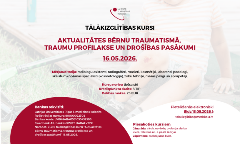 Norādot: 21359 tālākizglītības kursi “Aktualitātes bērnu traumatismā, traumu profilakse un drošības pasākumi” 16.05.2026.