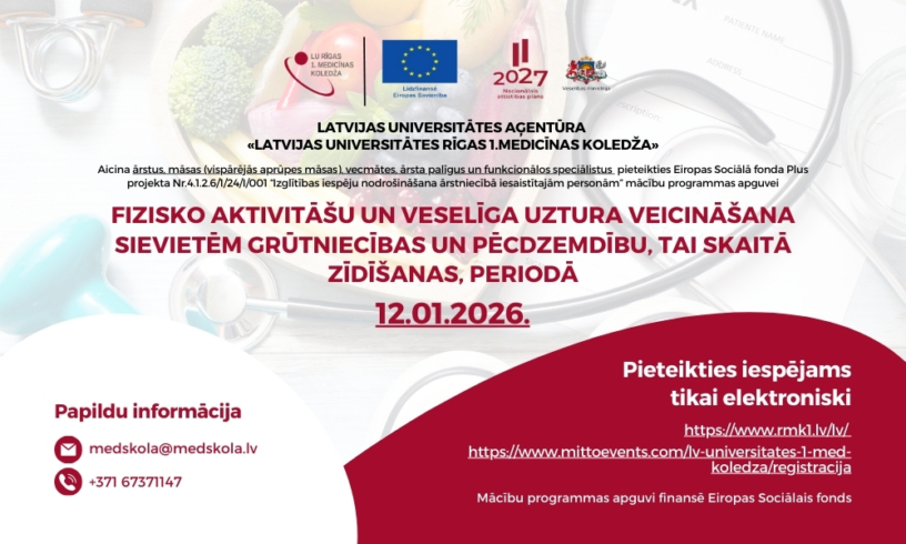 Aicinām apgūt mācību programmu “Fizisko aktivitāšu un veselīga uztura veicināšana sievietēm grūtniecības un pēcdzemdību, tai skaitā zīdīšanas, periodā”, kas norisināsies 2026. gada 12. janvārī no plkst. 9.00 līdz 16.10., Tomsona ielā 37, Rīgā.