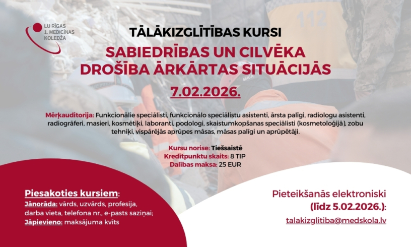 Norādot: 21359 tālākizglītības kursi “Sabiedrības un cilvēka drošība ārkārtas situācijās” 7.02.2026.