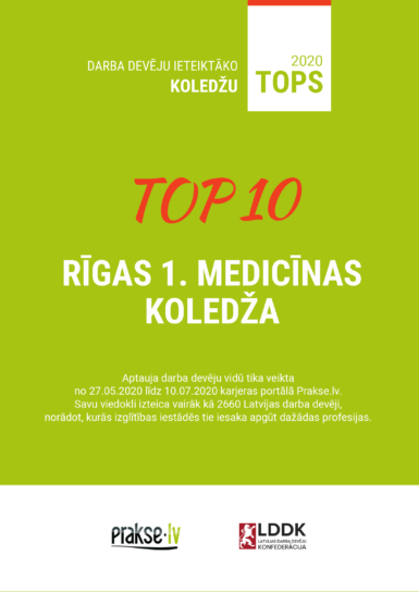 Ar patiesu gandarījumu un prieku paziņojam, ka LU Rīgas 1. medicīnas koledža saņēmusi augstu novērtējumu Darba devēju ieteiktāko Skolu un studiju TOPā 2020. Šogad savu vērtējumu izteica 2660 Latvijas darba devēji, norādot, kurās izglītības iestādēs tie iesaka apgūt dažādas profesijas. LU Rīgas 1. medicīnas koledža ir iekļuvusi darba devēju ieteiktāko koledžu TOP 10 sarakstā.